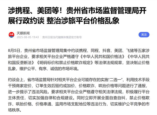 2025年8月,贵州省市场监管局集中约谈包括携程在内的五家涉旅平台。针对相关平台企业可能存在的实施“二选一”、利用技术手段干预商家定价、订单生效后毁约或加价、价格欺诈、哄抬价格等问题进行了通报,进一步提示了违法风险。