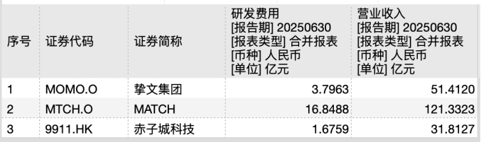 与同行业已上市公司相比,米连科技今年上半年的研发费用率也处于相对较低水平。证券之星根据Wind数据计算得出,同期,陌陌平台母公司挚文集团(MOMO.O)、SUGO母公司赤子城科技(9911.HK)、Tinder母公司MATCH(MTCH.O)的研发费用率分别为7.39%、13.89%、5.28%,均高于米连科技。