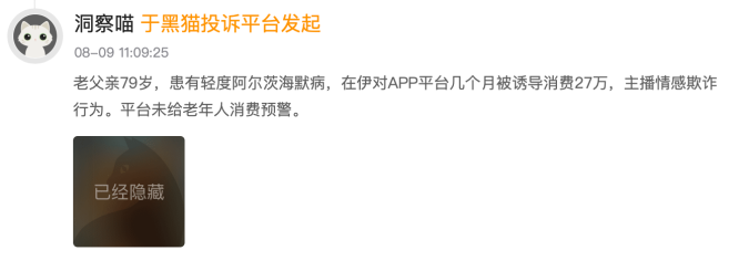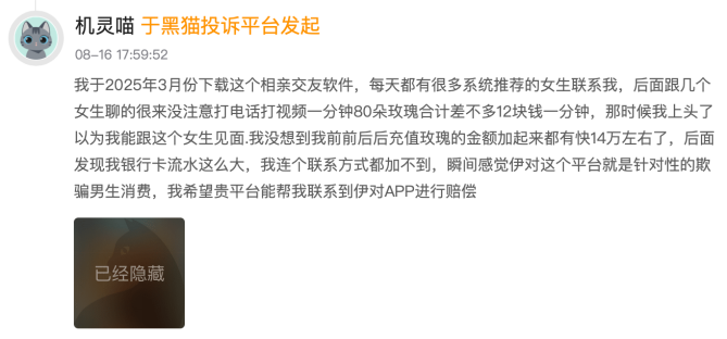 例如,用户“机灵喵”投诉称,其前后累计充值近14万元,却仍未成功获取对方联系方式;另一用户“洞察喵”则反映,家中80岁高龄、患有轻度阿尔茨海默症的老人,在几个月内被诱导消费高达27万元,期间平台未对老年人进行消费风险提示。