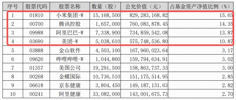 根据基金二季报,截至二季度末,港股互联网ETF(513770)持仓前4大个股分别为小米集团-W、腾讯控股、阿里巴巴-W、美团-W,合计权重占比54.74%,前十大持仓股合计权重超72%。