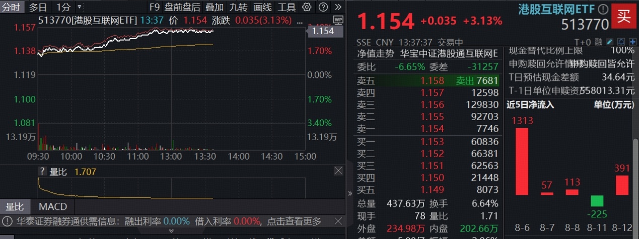 重仓港股互联网龙头的港股互联网ETF(513770)高开高走,场内价格现涨逾3%,实时成交额超5亿元,交投活跃。