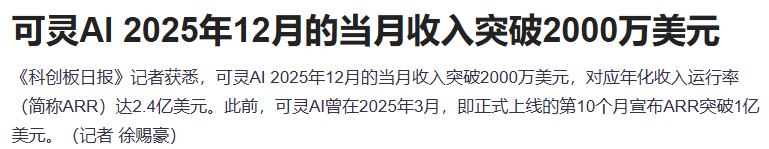 据报道,可灵AI 2025年12月的当月收入突破2000万美元,对应年化收入运行率(简称ARR)达2.4亿美元。