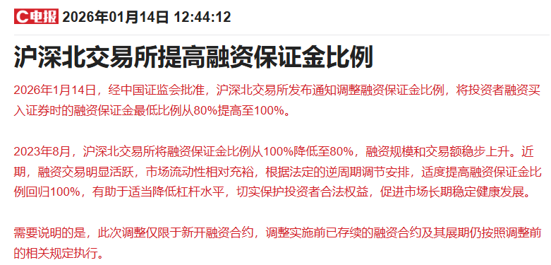 经中国证监会批准,沪深北交易所发布通知调整融资保证金比例,将投资者融资买入证券时的融资保证金最低比例从80%提高至100%。