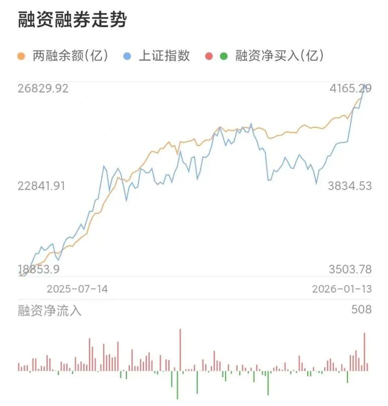 元旦节后A股投机情绪高昂,与之对应的是融资余额快速攀升,从1月5日到1月13日仅仅7个交易日,融资余额新增超过1400亿,其中仅1月12融资净买入460.53亿,在历史单日融资买入中排第三,仅次于2024年国庆节后两天。