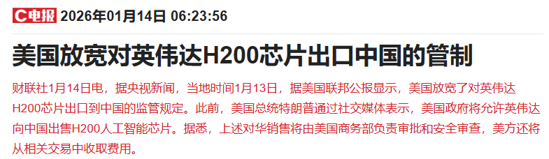 据央视新闻,当地时间1月13日,据美国联邦公报显示,美国放宽了对英伟达H200芯片出口到中国的监管规定。虽然美国那边通过,但我们这边能不能进来尚有不确定性。