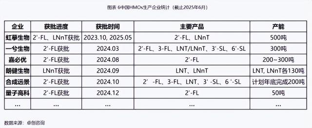据卓创咨询统计,到2025年6月底,我国共有6家进口企业和6家本土企业的HMOs获得国家卫健委批准。目前,接近20种HMOs(多种母乳低聚糖的组合)产品获得国家卫生健康委员会批准为食品营养强化剂,我国已建设完成的母乳低聚糖产能超1500吨,在建产能在数千吨以上。
