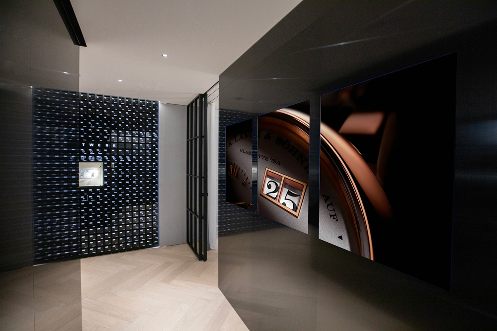 一层空间始于橱窗内展示的一座以ZEITWERK时间机械腕表的机芯数字盘元素打造的装置,随之来到朗格六大腕表系列陈列区,包括LANGE 1朗格1系列、SAXONIA萨克森系列、1815系列、RICHARD LANGE理查朗格系列、ZEITWERK时间机械系列、ODYSSEUS奥德修斯系列。与之相邻,特别陈列1815腕表及古董怀表,与一面数字化显示的历史墙。历史墙另一侧展示的是朗格极具创新的ZEITWERK时间机械腕表及其由451个零件组成的机芯墙。在一层,宾客可品鉴当季推出的新款腕表、旗舰店特别款腕表,以及其他精选腕表,亦可至特别打造的贵宾尊享区,试戴体验精密时计作品。