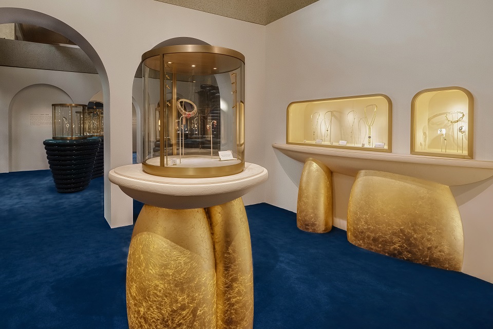 作为整场展览的终章,“典藏长廊”展厅四根中央立柱分别呈现品牌四大独特工艺的精髓:蕾丝镂空、“Honeycomb”蜂巢工艺、手工雕刻(包括“Rigato”“Telato”“Segrinato”“Ornato”以及“Modellato”五大独创技法)、连环成链。两侧立柱则汇集品牌创立至今最具标志性的作品系列,彰显布契拉提美学风格的延续与演进。