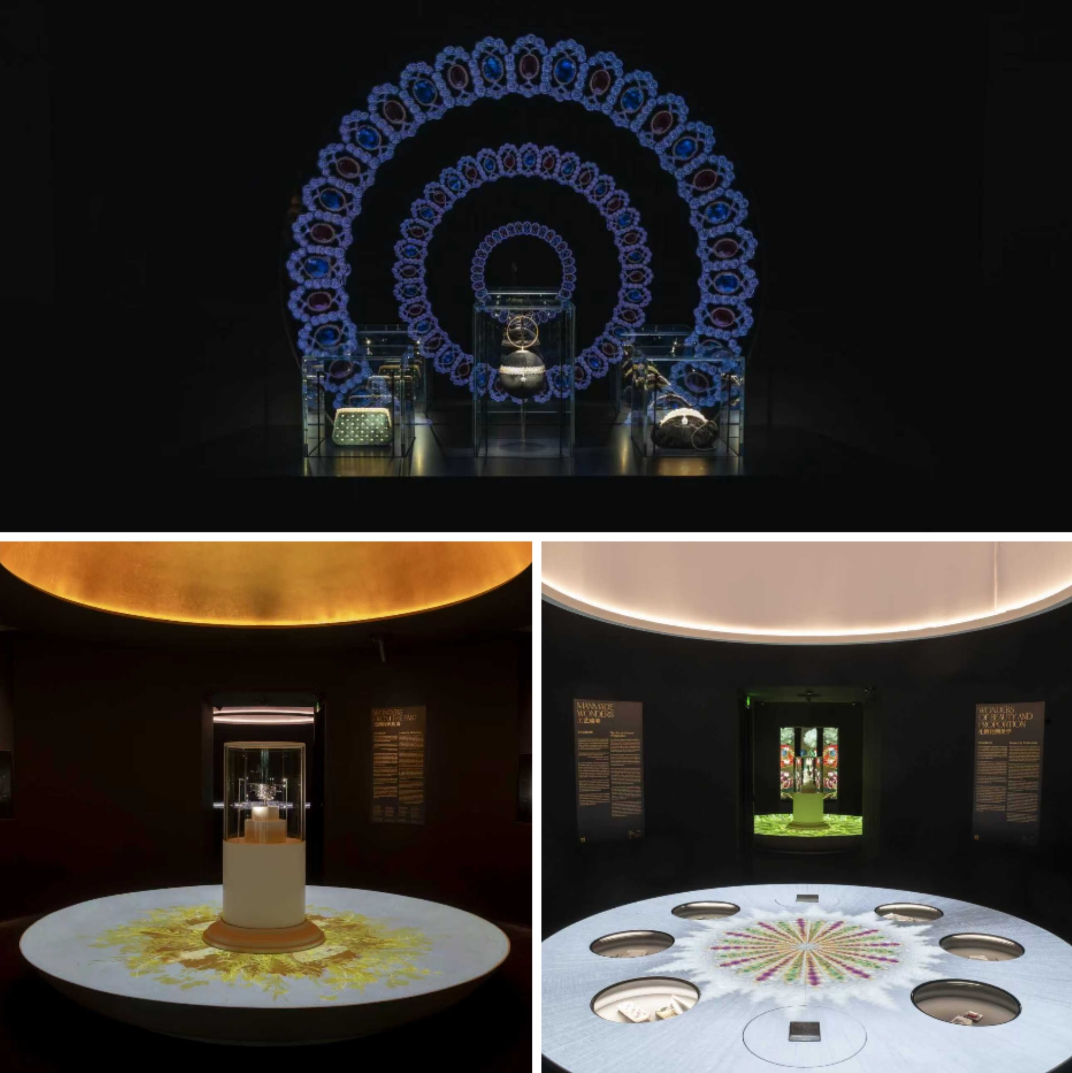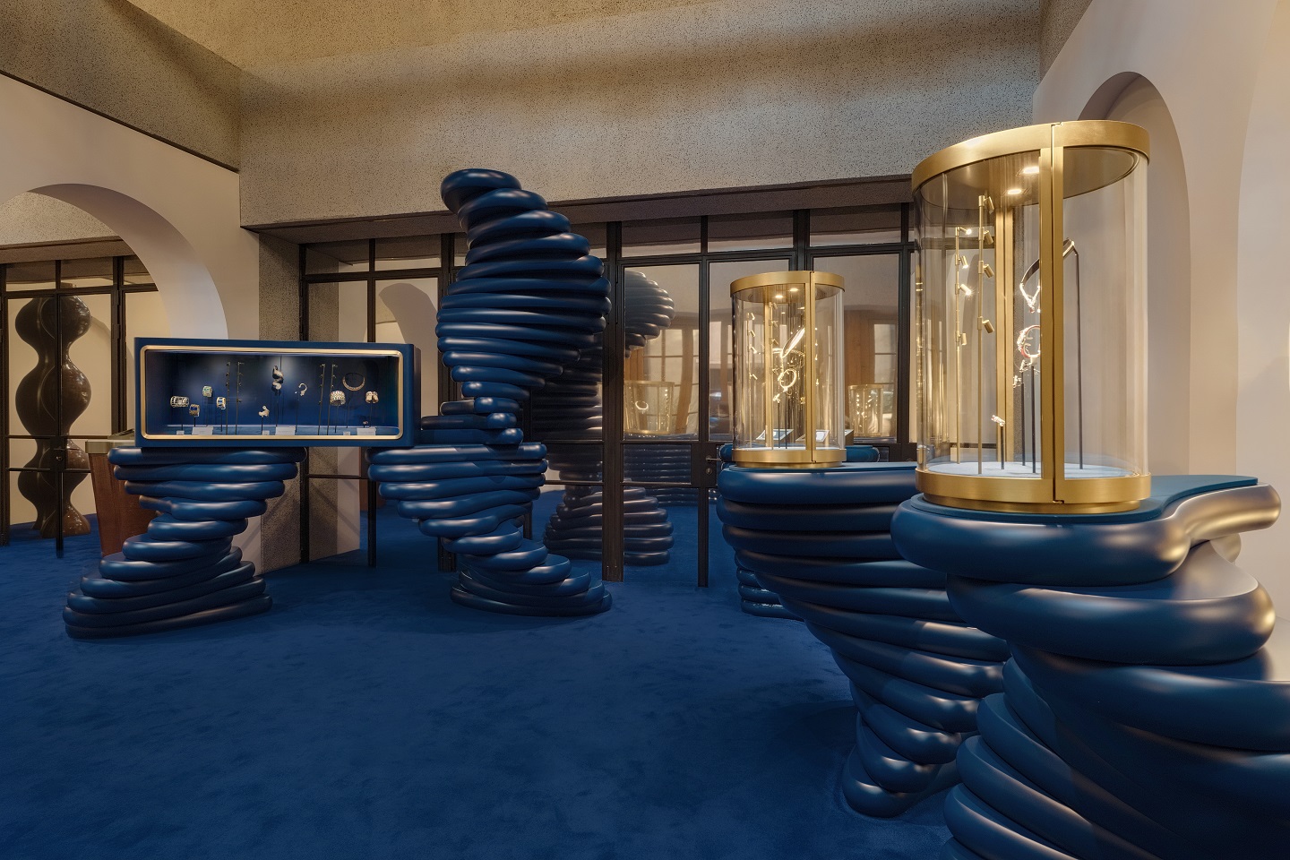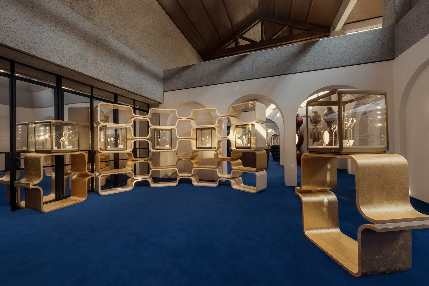 Piaget Society主题展区空间内布置有蓝色的旋转装置,其设计灵感源自法国的塞特小镇(Sète)层级而上的自然风光, 同时也是向20世纪80年代克劳德·蒙塔纳(Claude Montana)推出的经典香水的瓶身造型致敬。此展区的高级珠宝作品充斥着浓郁的色彩,珍贵的宝石与独特的造型,将Piaget Society的欢欣愉悦氛围打造得淋漓尽致。来宾更能鉴赏难得一见的Patrimony私人典藏系列作品。