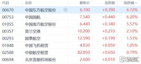 航空股活跃,中国东方航空股份、中国国航涨超6%,中国南方航空股份、国泰航空、中国飞机租赁等跟涨。