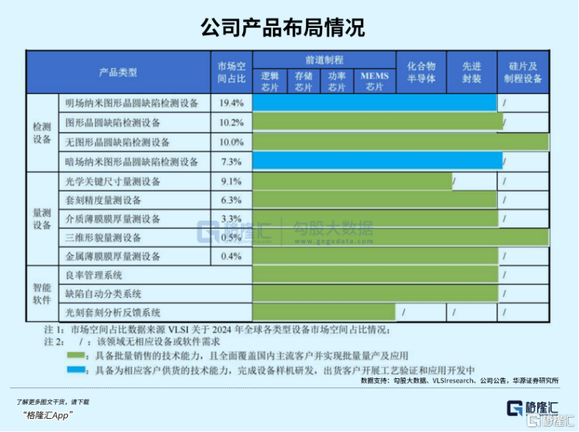 产品矩阵覆盖70%市场:公司已形成“九大设备+三大软件”的全流程解决方案——七大设备系列(如无图形晶圆检测、三维形貌量测)实现批量量产,在国内头部晶圆厂产线应用;另外两大系列完成样机研发并进入客户验证;三大良率管理软件(如缺陷自动分类系统)全部落地头部客户,形成“设备+软件”的协同效应。2025H1,公司产品覆盖约70%的量检测设备市场容量,是国内唯一能提供全流程质量控制方案的厂商。