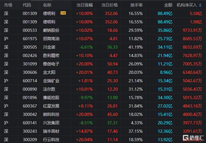 龙虎榜中涉及机构专用席位的个股中,当日净买入额前三为德明利、顺钠股份、招商南油,分别为1.98亿元、9733.91万元、8685.53万元。