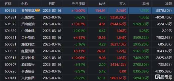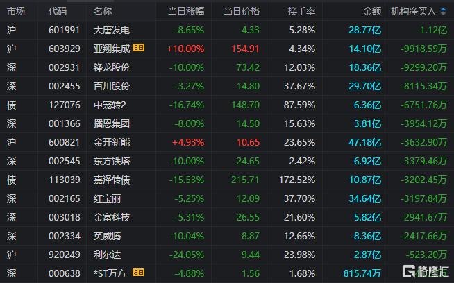 龙虎榜中涉及机构专用席位的个股中,当日净卖出额前三为大唐发电、锋龙股份、百川股份,分别为1.12亿元、9299.2万元、8115.34万元。