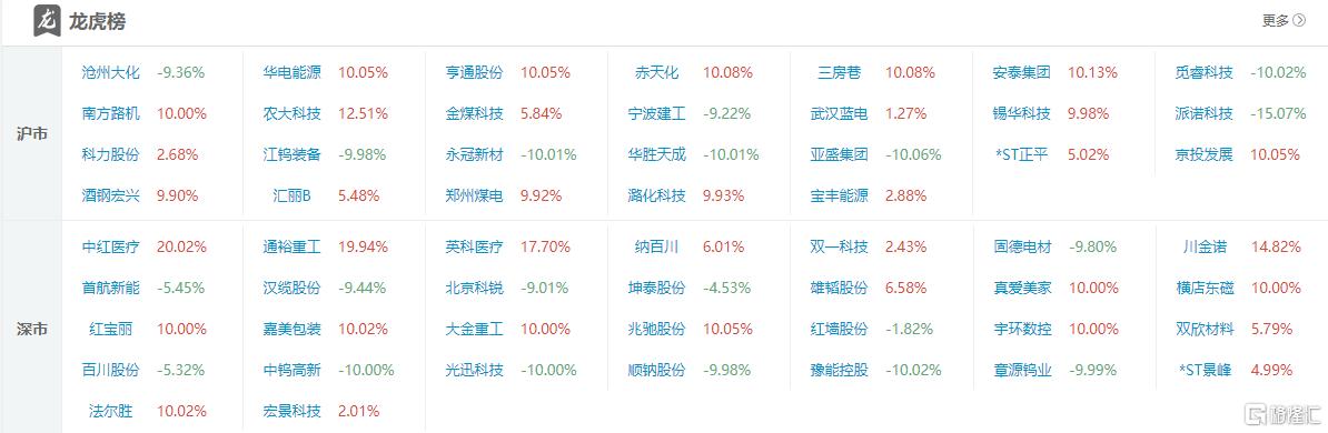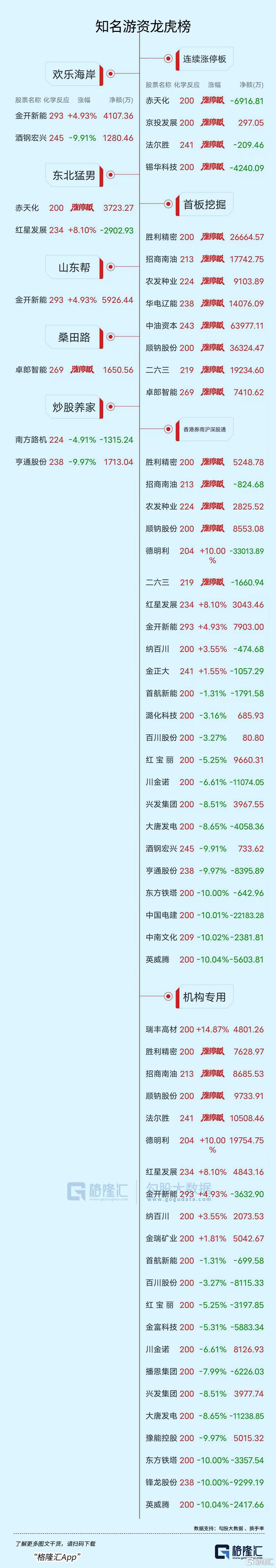 龙虎榜单日净卖出额前三为中国电建、金正大、红宝丽,分别为9.23亿元、3.8亿元、3.16亿元。