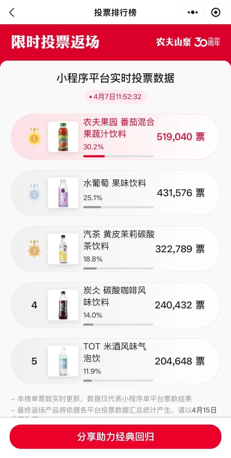 农夫山泉的返场限时投票引发广泛关注:仅小程序渠道,首周便收获171万张投票。至活动结束,全渠道累计超300万张。2004年上市的“农夫果园 番茄混合果蔬汁饮料”票数最高,以95.9万票“C位出道”;2016年上市的“水葡萄果味饮料 ”、2022年上市的“汽茶黄皮茉莉碳酸茶饮料”位列第二、第三,分别获票77.4万、58.1万。