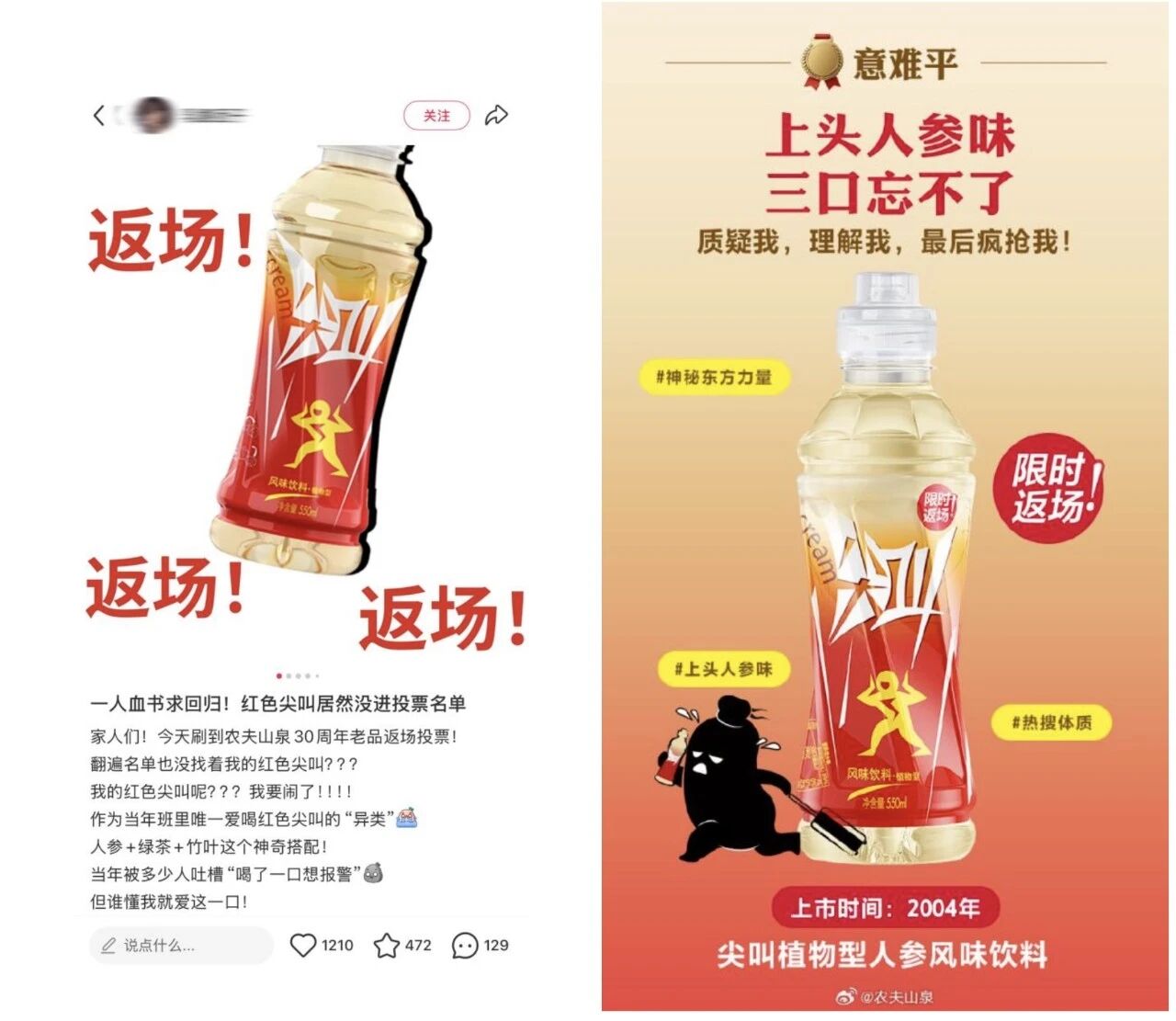 与上述三款产品不同,红色尖叫的返场是网友“喊”出来的:“没有红色尖叫返场我不同意”“不懂养生的我现在懂了”……“听劝”的农夫山泉特设“意难平”奖将其破格纳入返场名单。