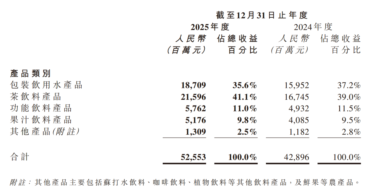 据农夫山泉(09633.HK)财报,2025年其营收首次突破500亿元,达525.53亿元;其中,茶饮料业务同比增长29.0%,实现营收215.96亿元,占总收益的41.1%。这是自2024年以来,茶饮料业务再次超越包装水,成为农夫山泉的第一大收入来源。