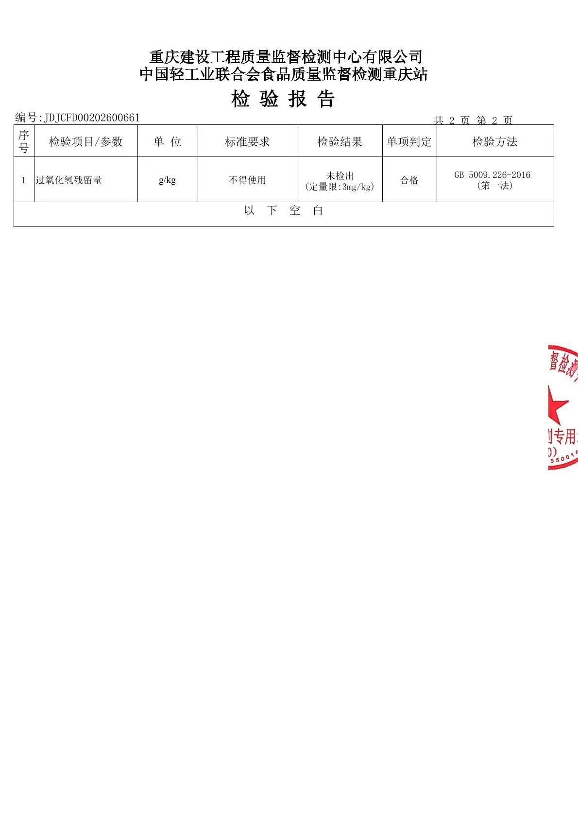 公司表示,所有受检产品及原材料均未检出过氧化氢(俗称“双氧水”),各项指标符合《中华人民共和国食品安全法》及国家食品安全相关标准要求,产品质量“安全可控”。