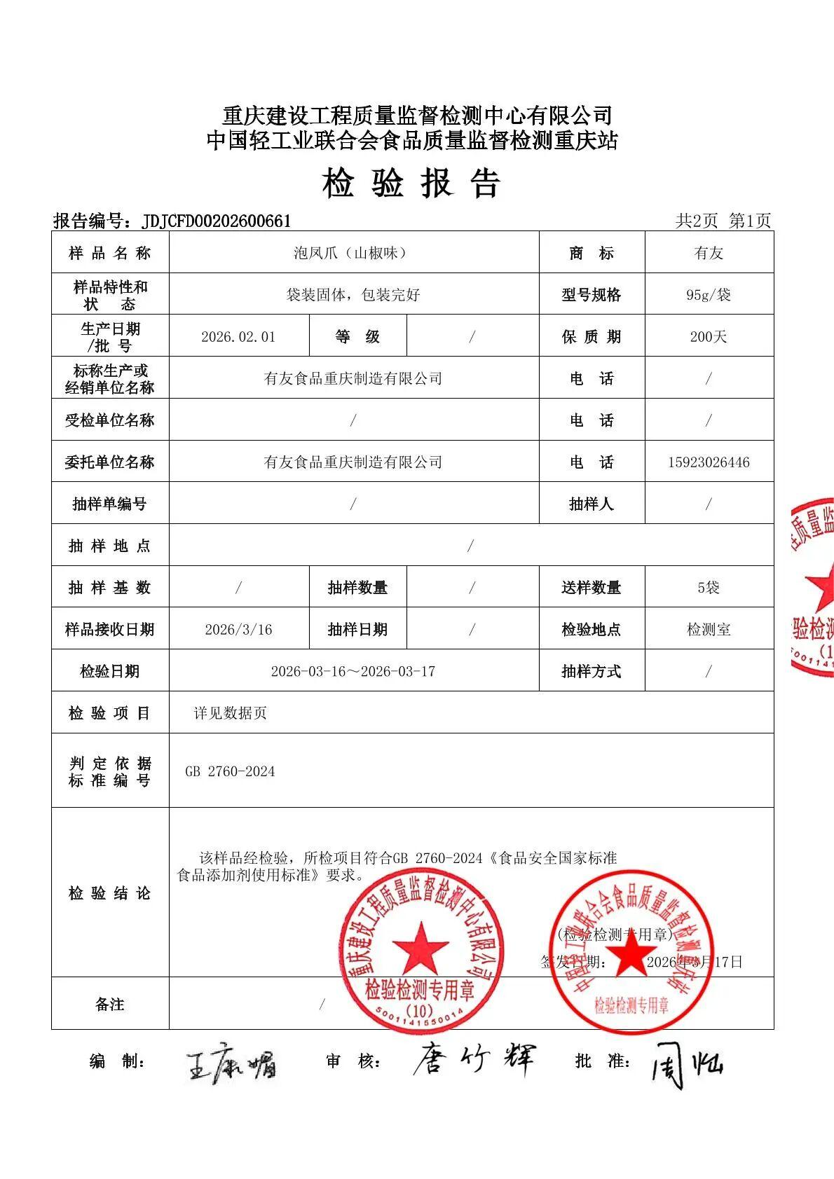 从公司随声明披露的多份检测报告看,此次送检样品主要包括双味泡凤爪、泡凤爪(山椒味)不同规格产品、山椒泡凤爪,以及鸡爪原料A、鸡爪原料B等。检测报告显示,所列检测项目为“过氧化氢残留量”,标准要求为“不得使用”,检验结果均为“未检出(定量限:3mg/kg)”,单项判定为合格。
