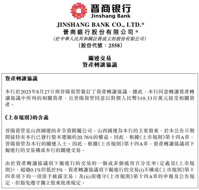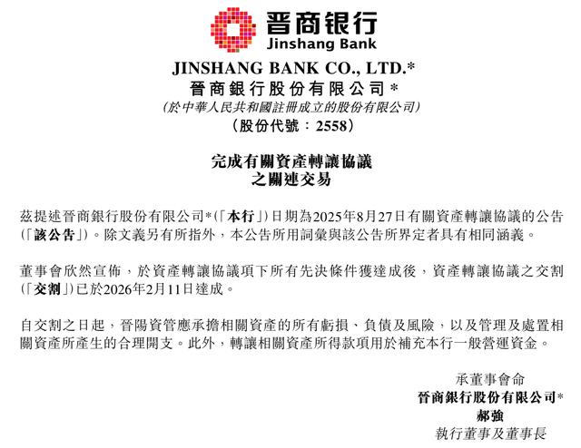 作为山西省唯一的省级法人城市商业银行,近日,晋商银行股份有限公司(HK:02558,下称“晋商银行”)发布公告称,所有先决条件获达成后,其资产转让协议的交割已于2026年2月11日达成。