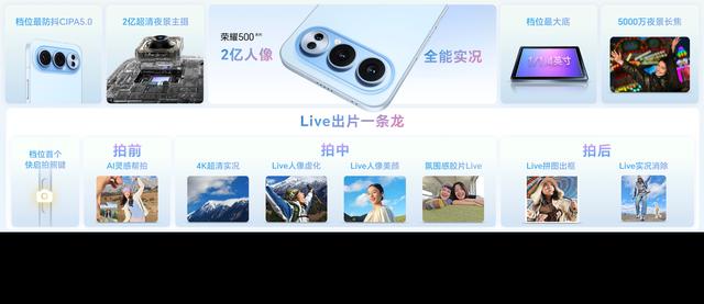 在影像体验层面,荣耀500系列带来档位超全实况体验,针对Live实况拍摄场景,行业首发前后置Live人像,让live帧帧有虚化,帧帧有美颜,帧帧有氛围。荣耀500系列还带来行业超全的氛围感胶片色彩,共有6种胶片Live任意挑选。同时,Live路人消除也让动态瞬间免受路人干扰,时刻主角。此外还支持4K转Live,轻松将4K视频转成4K Live分享朋友圈。