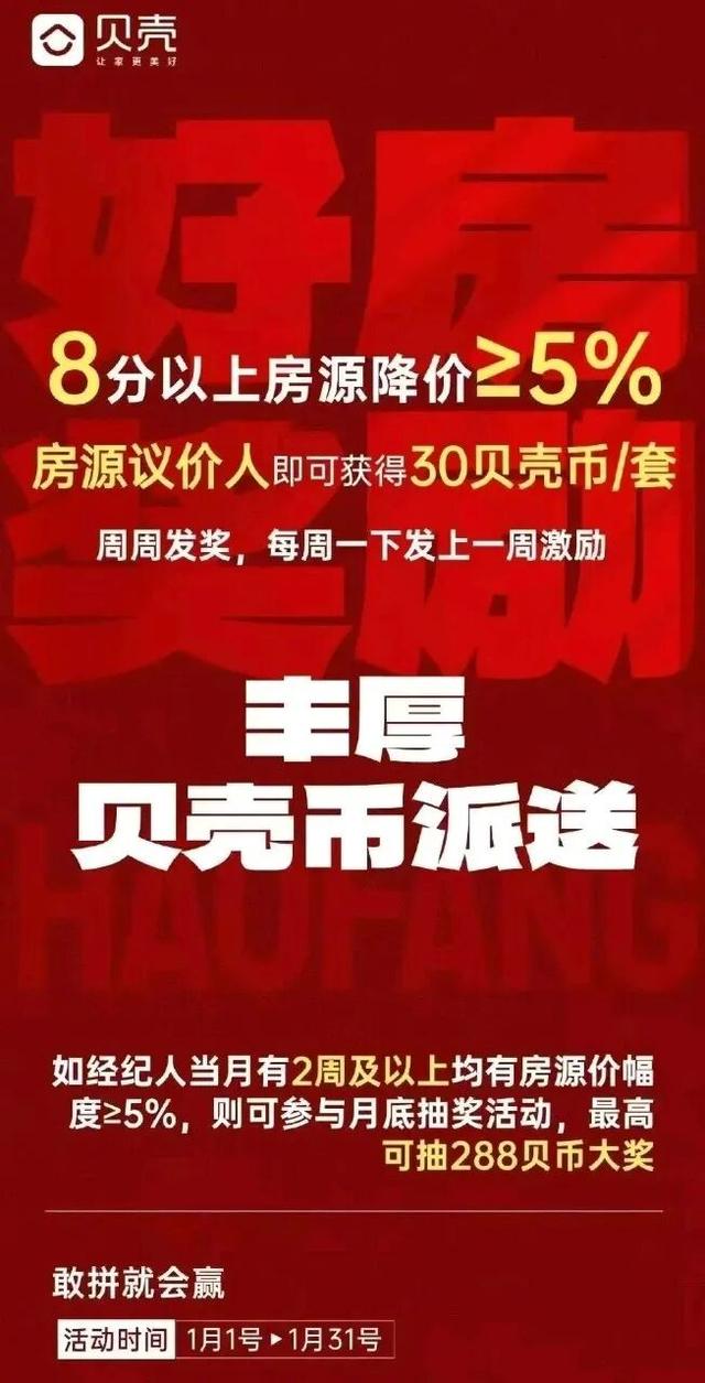 这张海报的核心内容非常直白:8分以上房源降价≥5%,房源议价人即可获得30贝壳币/套的奖励。