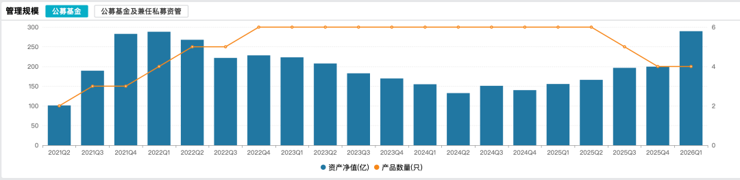 另一方面,资金涌入的速度也极为惊人。基金规模从2025年末的2.54亿元迅速膨胀至2026年一季度末的120亿元,短短一个季度,规模增长近47倍。与此同时,唐晓斌整体在管规模也从2025年末的200亿元升至2026年一季度末的290亿元。