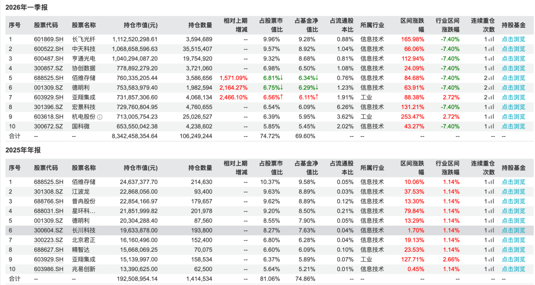 2025年年报中,基金前十大重仓以存储芯片赛道为主,佰维存储、江波龙、普冉股份等标的占据核心仓位,彼时市场主线仍围绕存储芯片的周期反转展开。