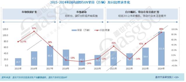即便从整个行业看,越野市场也足够大。来自盖世研究院的数据显示,自2021年长城坦克系列掀起越野热后,越野SUV的销量再次进入高速增长阶段,仅在去年,同比增速就达到了80%以上。