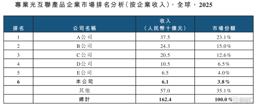 华工科技于2025年位列全球专业光互联产品供应商第6名,当年实现光互联业务营收61亿元,全球市场占有率为3.8%。