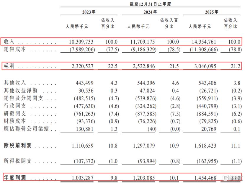 2023年、2024年及2025年(报告期),公司的收入分别为103.1亿元、117.09亿元、143.55亿元,毛利率分别为22.5%、21.5%、21.2%,净利润分别为10.03亿元、12.03亿元、14.55亿元,以2025年的净利润来算,公司的静态PE为80倍。