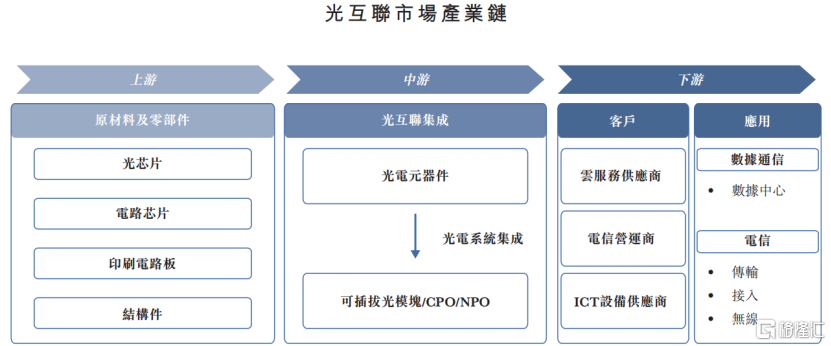 上游以材料与零部件供应为核心,包含光芯片、电芯片、印制电路板及结构件等核心零部件。