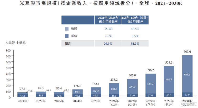 光互联市场规模(按企业收入,按应用领域拆分),来源:招股书
