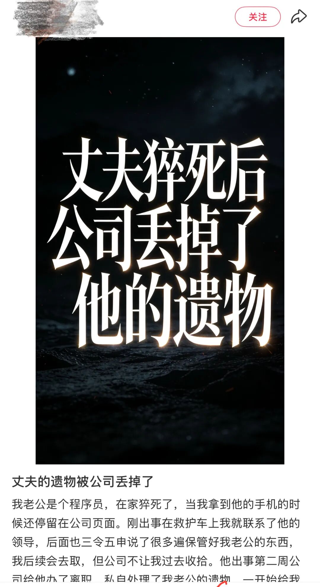 此外,6天前,杨女士还在社交平台上发帖,称丈夫猝死后,公司丢掉了他的遗物。
