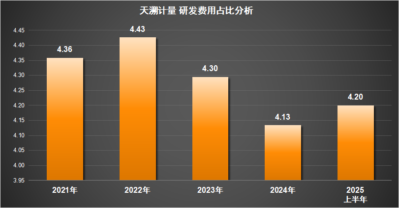 身处技术密集型的检测行业,天溯计量的研发投入却长期低于行业水平。从研发费用来看,天溯计量2020至2024年的平均研发费用仅为2598万元。而2022至2024年的研发费用占比,天溯计量从4.43%降至4.13%,不足行业均值的一半。