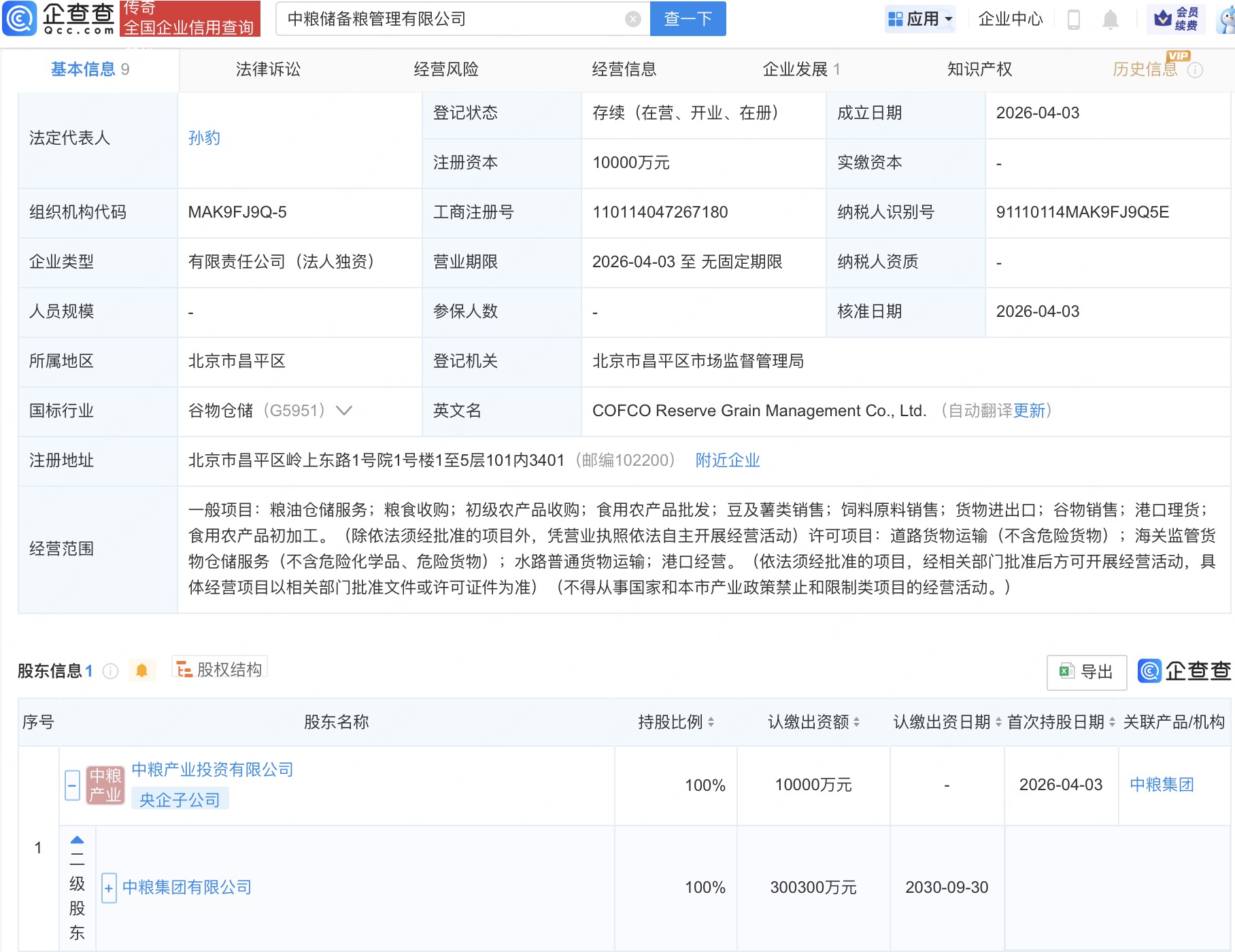 企查查APP显示,近日,中粮储备油管理有限公司、中粮储备粮管理有限公司成立,注册资本均为1亿元,经营范围包括粮油仓储服务、粮食收购、初级农产品收购等。企查查股权穿透显示,上述两家公司均由中粮集团有限公司间接全资持股。