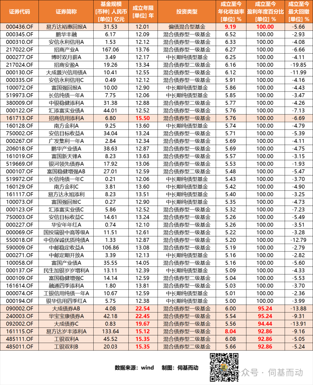 易方达裕惠回报A(000436):偏债混合,超9%年化收益率、100%的历史年度胜率,历史最大回撤仅-5%;
