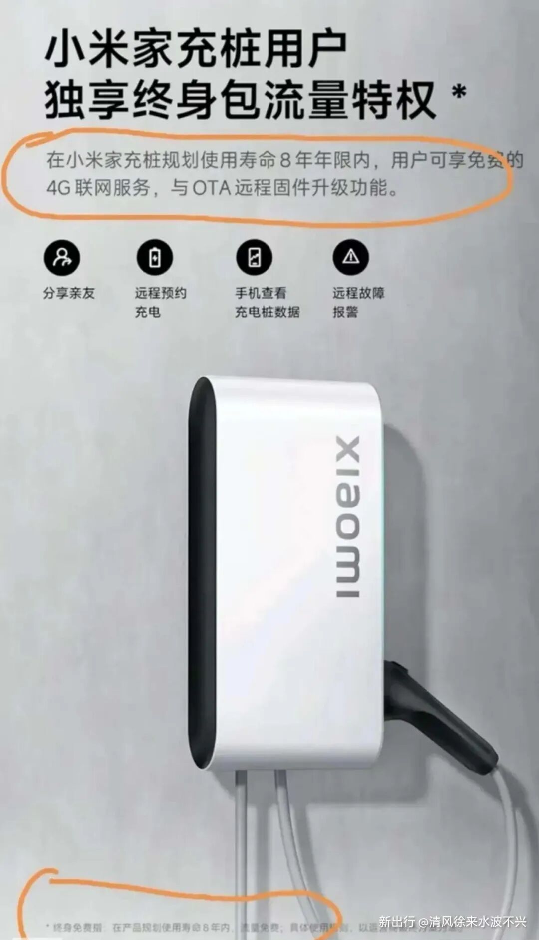 还有一次小米充电桩宣传海报写着“小米家充桩用户独享终身包流量特权”,但小字补充“产品规划使用寿命8年”,即实际权益期仅有8年。