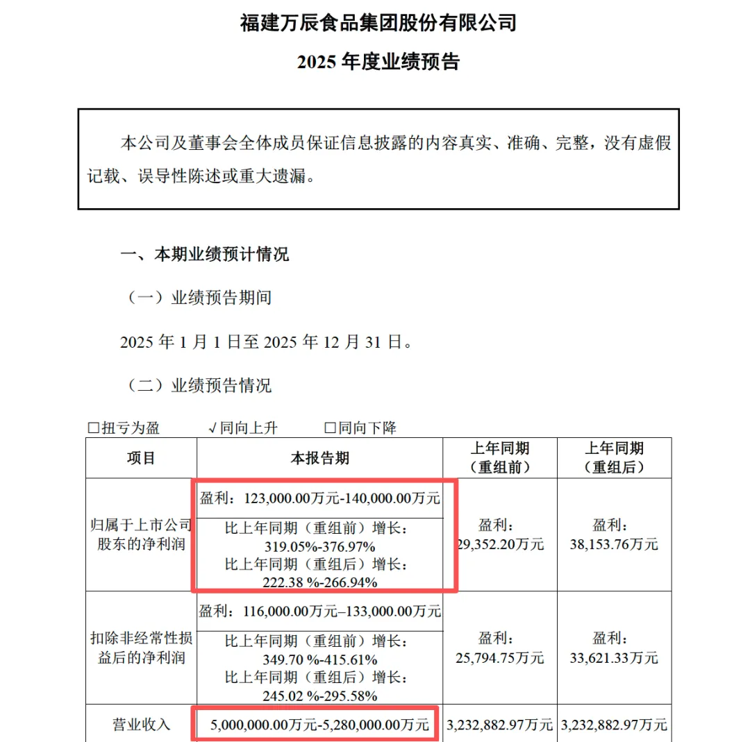 业绩方面,万辰集团披露的2025年度业绩预告显示,公司全年营收预计突破500亿元大关,归母净利润12.3亿元至14亿元,同比增长超220%,核心业务量贩零食营收占比超98%。