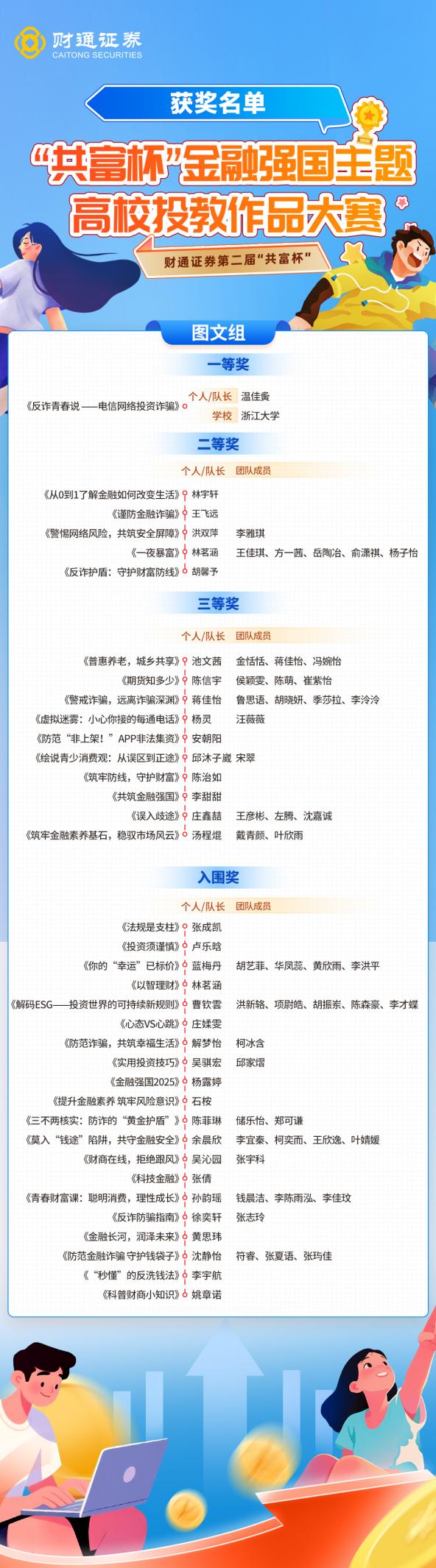 “金融强国梦,青春创投教”——第二届财通证券“共富杯”金融强国主题高校投教作品大赛获奖名单正式公布。本届大赛共收到全国高校有效投稿作品476件,根据大赛颁奖安排,最终评选出视频类与图文类一等奖、二等奖、三等奖及入围奖。获奖作品主题紧密围绕金融知识普及、投资者权益保护及金融风险防范等核心议题。