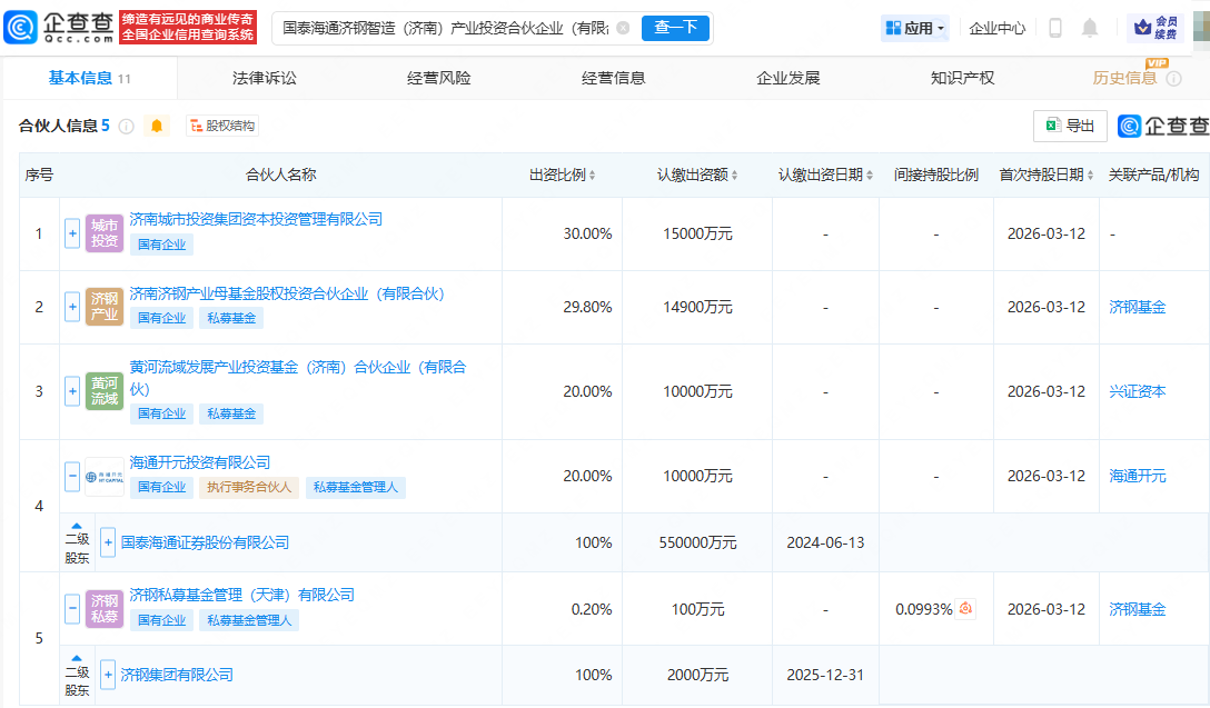 企查查APP显示,近日,国泰海通济钢智造(济南)产业投资合伙企业(有限合伙)成立,出资额5亿元,经营范围包含:以自有资金从事投资活动;以私募基金从事股权投资、投资管理、资产管理等活动。企查查股权穿透显示,该合伙企业由国泰海通(601211)旗下海通开元投资有限公司、济钢集团有限公司旗下济钢私募基金管理(天津)有限公司等共同持股。
