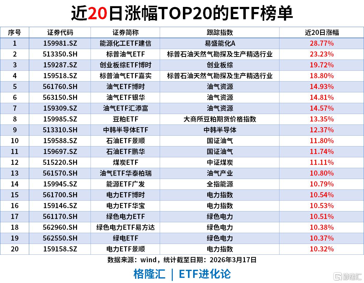 近20个交易日,市场的审美瞬间发生了从“弹性”到“硬核资产”的漂移。能源化工ETF(159981)以28.77%的涨幅居首,标普油气ETF(513350)则录得23.23%。