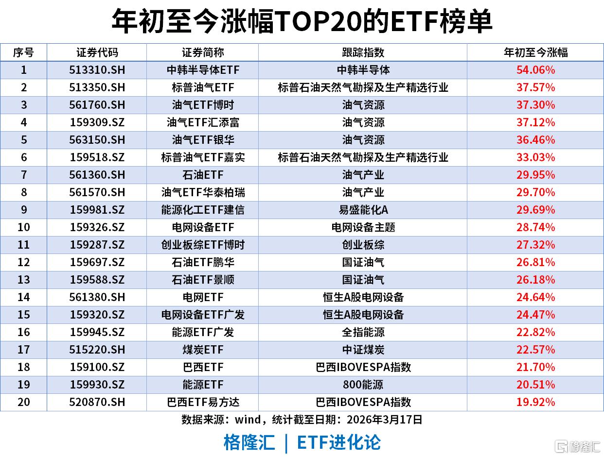 年内涨幅榜,中韩半导体ETF(513310)涨幅高达54.06%。海外资产崛起:标普油气(37.57%)、巴西ETF(21.79%)悉数在列。