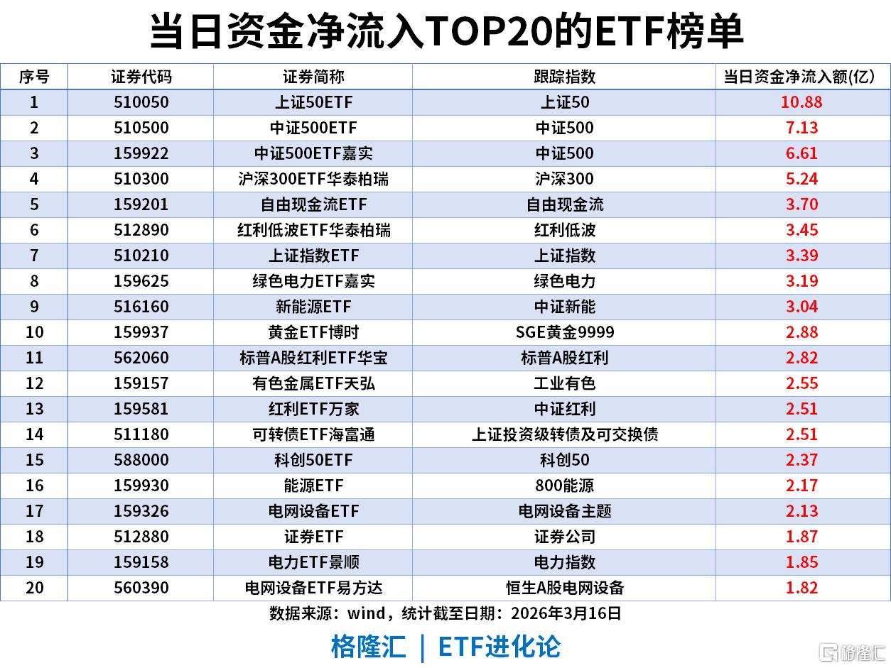 在资金净流入榜中,上证50ETF(510050)单日净流入10.88亿,中证500ETF(510500)流入7.13亿。