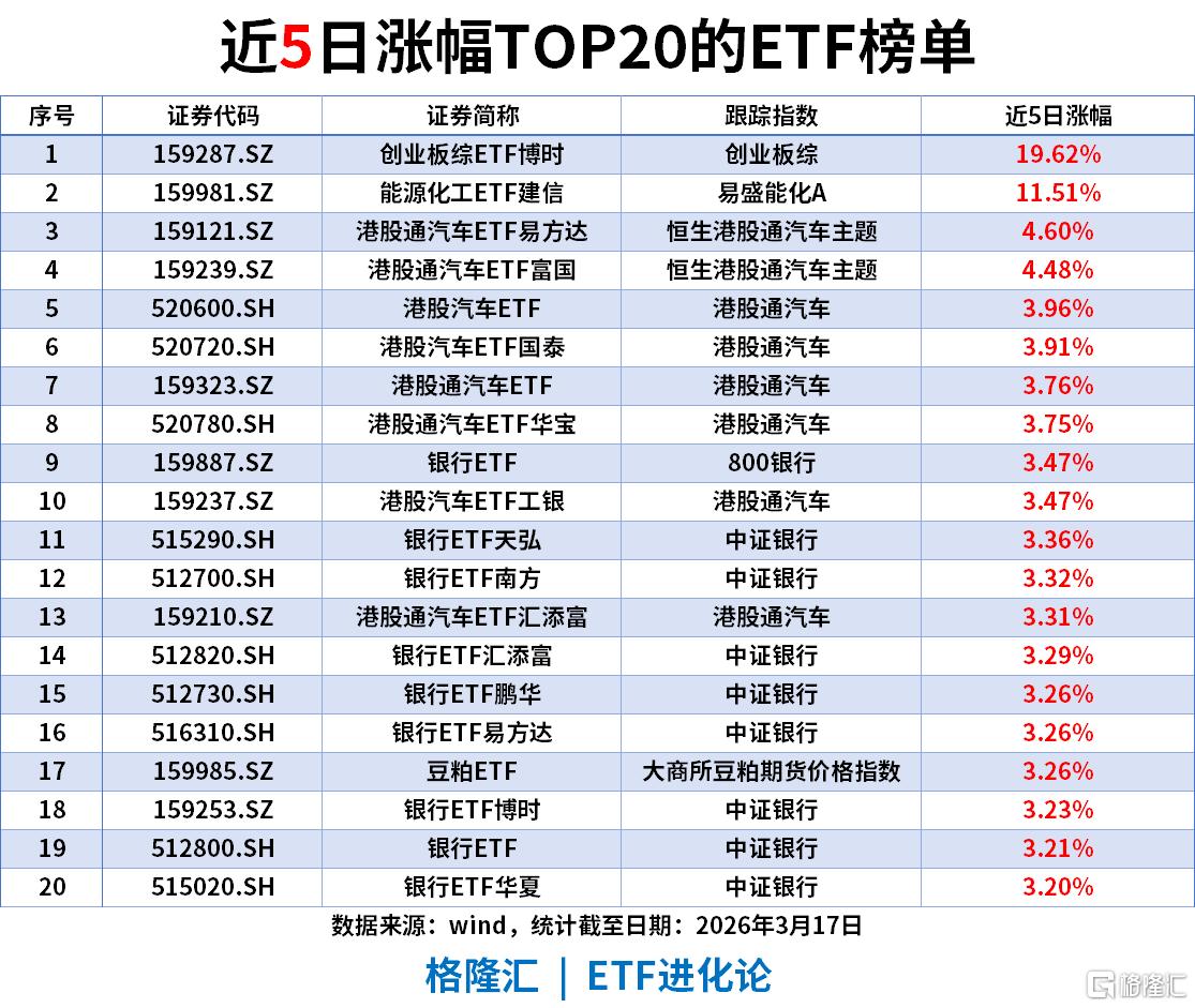 近5日涨幅TOP20的ETF榜单,创业板综ETF博时、能源化工ETF建信、港股通汽车ETF易方达、港股通汽车ETF富国、港股汽车ETF 、银行ETF天弘上榜。