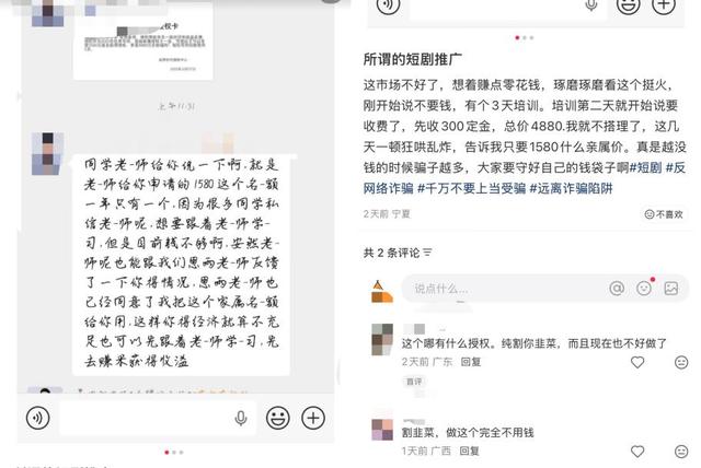 从这个角度来看,对于那些把短剧推广当成一条好财路的人而言,该赛道的实际下场体验早就被替换成“耗时”“低薪”“高风险”了,而那些入场比较早,确实从中吃到红利的人,或许正是已经转变思路靠卖课收割新人的“前辈”。培训班骗局为何屡禁不绝?