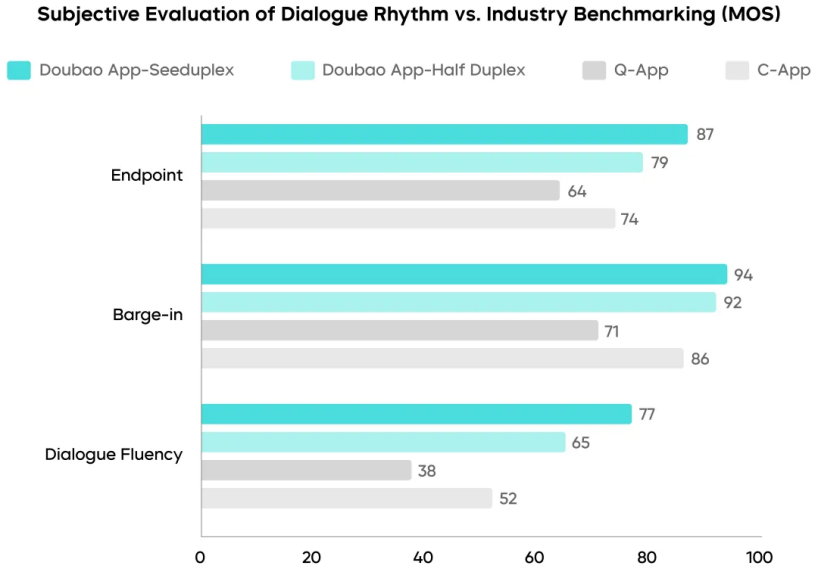 测试数据显示,相比上一代半双工豆包端到端语音模型,Seeduplex的判停MOS分提高了8%,对话流畅度MOS分提升了12%。
