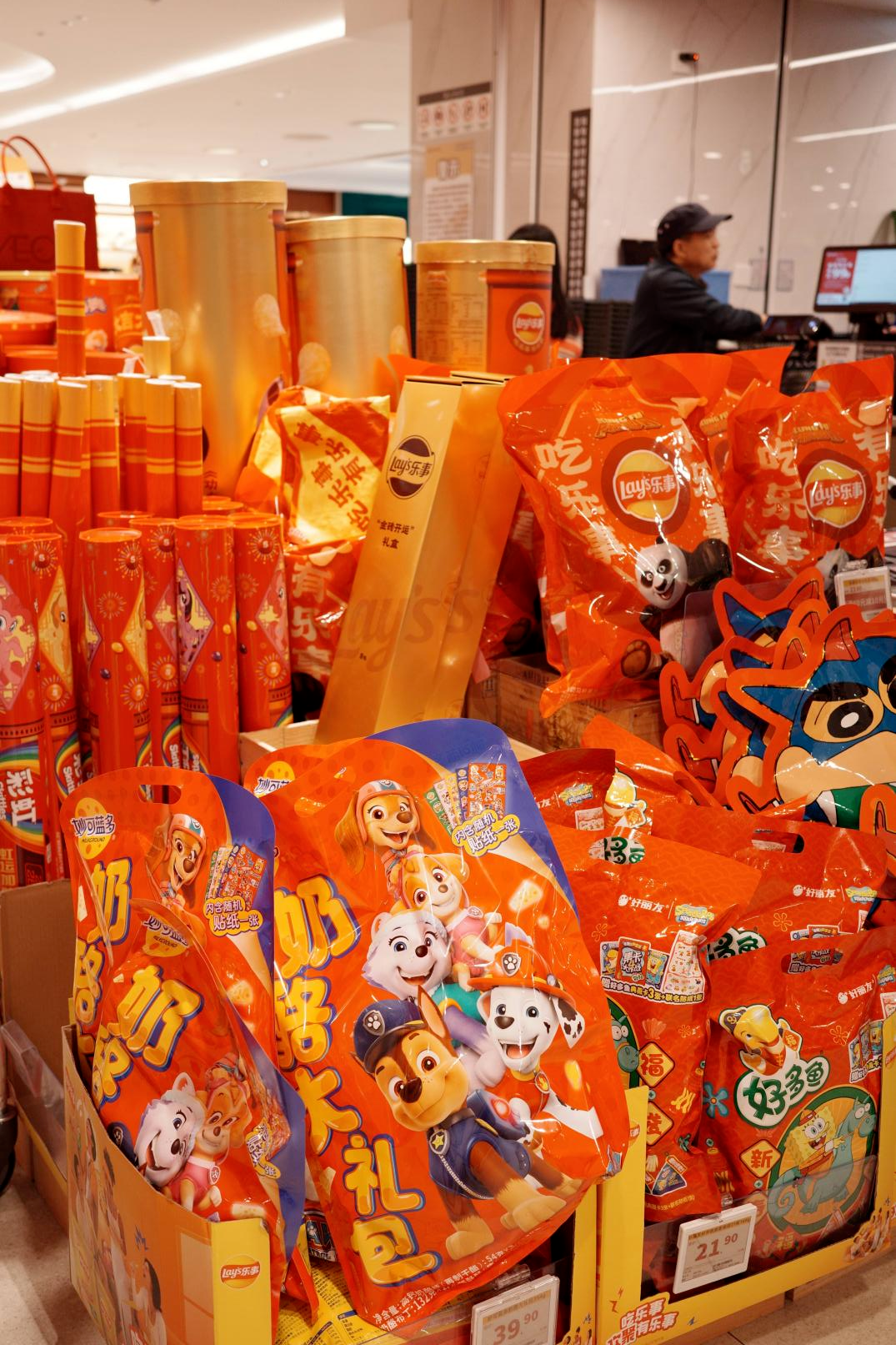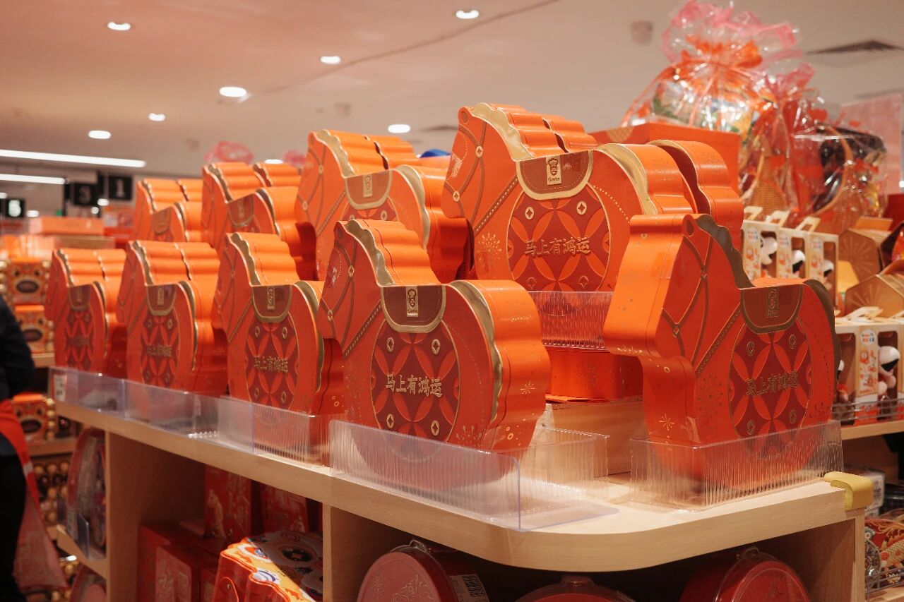 10升装的大啤酒、麻将造型的曲奇、金币造型的什锦糖以及红色小马造型的礼盒……商超的年货货架,成为“显眼包”的秀场。