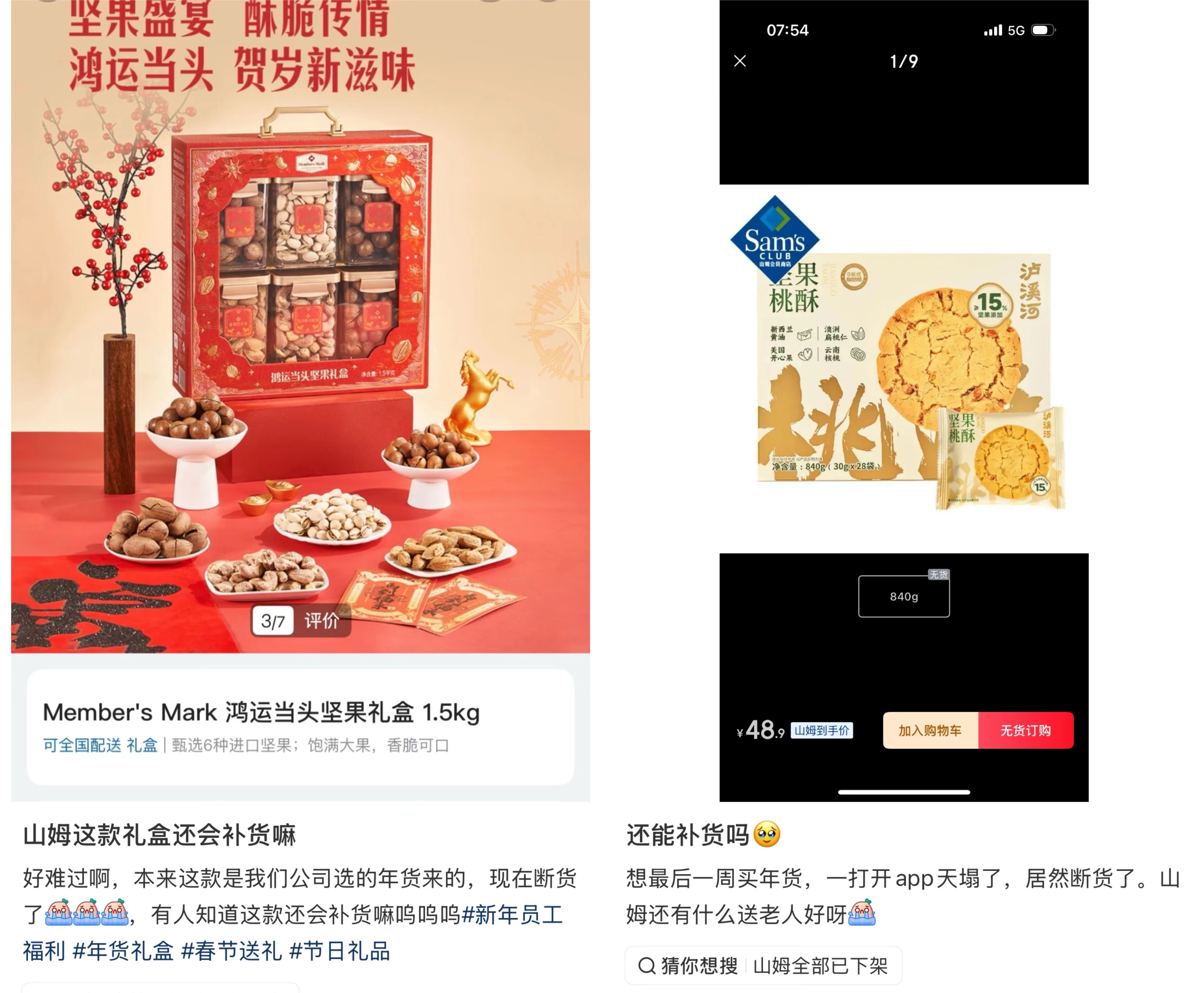 此外,坚果礼盒已是今年年货顶流。山姆会员商店自有品牌Member’s Mark推出的“鸿运当头”坚果礼盒(168元/1.5kg),凭借分量足、种类齐全、价格亲民、颜值出众,成为年货界的网红单品,不仅线下早已卖断货,山姆会员App也显示“下架”、无货可售,代购甚至将其炒到300多元,火爆程度可见一斑。