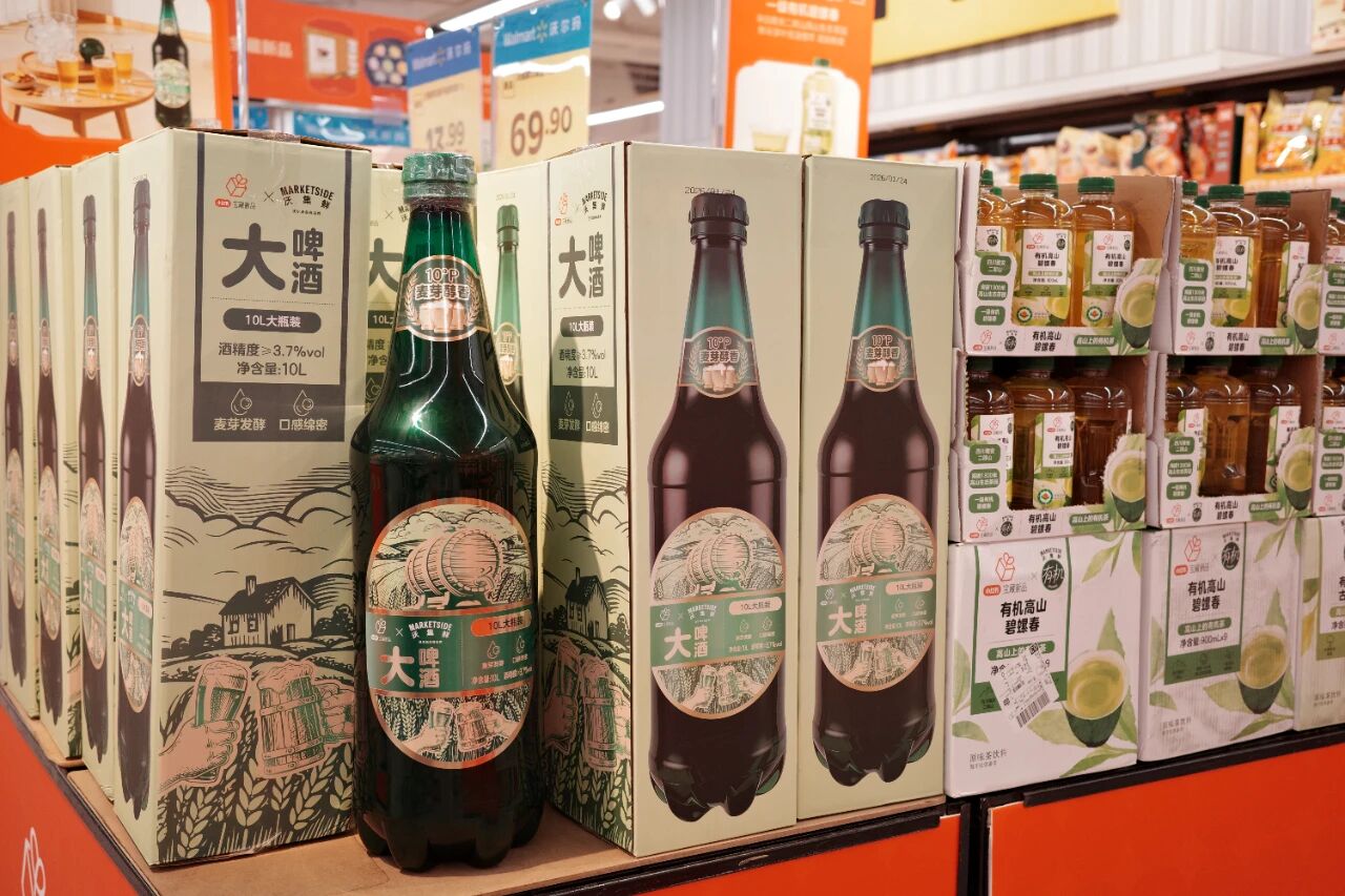 沃尔玛自有品牌“沃集鲜”联手小红书推出了多款年货产品,其中10升装的沃集鲜“大啤酒”成了吸睛王:一瓶相当于30罐330毫升常规装,瓶身敦实,抱起来有种踏实的富足感。